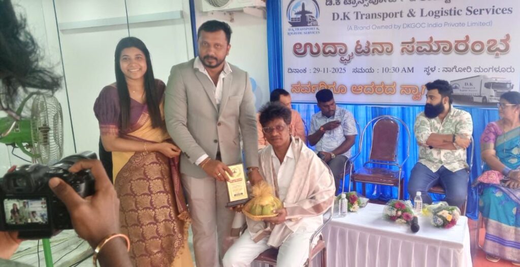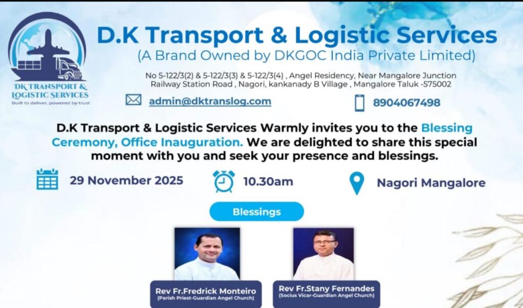 ನಾಗೋರಿ, ಮಂಗಳೂರು: ಡಿ.ಕೆ. ಟ್ರಾನ್ಸ್ಪೋರ್ಟ್ & ಲಾಜಿಸ್ಟಿಕ್ ಸರ್ವೀಸಸ್ ಸಂಸ್ಥೆಯ ಹೊಸ ಕಚೇರಿ ಉದ್ಘಾಟನಾ ಹಾಗೂ ಆಶೀರ್ವಾದ ಸಮಾರಂಭವು ನವೆಂಬರ್ 29, 2025ರಂದು ನಾಗೋರಿ, ಕಂಕನಾಡಿ ‘ಬಿ’ ವಿಲ್ಲೇಜ್ ಪ್ರದೇಶದ ಏಂಜಲ್ ರೆಸಿಡೆನ್ಸಿಯಲ್ಲಿ ಭವ್ಯವಾಗಿ ನೆರವೇರಿತು.