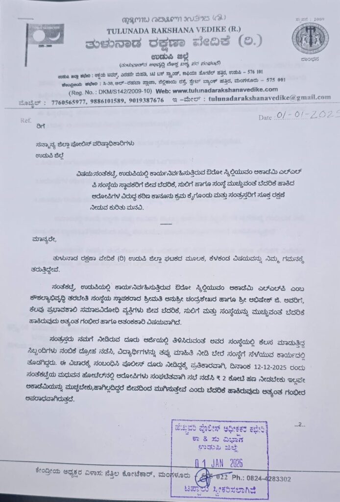 ಉಡುಪಿ | ಜನವರಿ 1, 2026 ಸಂತೆಕಟ್ಟೆ, ಉಡುಪಿಯಲ್ಲಿ ಕಾರ್ಯನಿರ್ವಹಿಸುತ್ತಿರುವ ಔರೋ ಸ್ಕಿಲ್ಲಿಯುವಂ ಅಕಾಡೆಮಿ ಎಲ್ಎಲ್ಪಿ ಸಂಸ್ಥೆಯ ಸ್ಥಾಪಕರಾದ ಅನುಶ್ರೀ ಚಂದ್ರಶೇಖರ ಹಾಗೂ ಅಭಿಷೇಕ್ ಜಿ. ಅವರಿಗೆ ಜೀವ ಬೆದರಿಕೆ, ಸುಲಿಗೆ ಮತ್ತು ಸಂಸ್ಥೆ ಮುಚ್ಚುವಂತೆ ಬೆದರಿಕೆ ಹಾಕಿರುವ ಪ್ರಕರಣಕ್ಕೆ ಸಂಬಂಧಿಸಿ, ಆರೋಪಿಗಳ ವಿರುದ್ಧ ತ್ವರಿತ ಹಾಗೂ ಕಠಿಣ ಕಾನೂನು ಕ್ರಮ ಕೈಗೊಳ್ಳಬೇಕು ಮತ್ತು ಸಂತ್ರಸ್ತರಿಗೆ ಪೊಲೀಸ್ ರಕ್ಷಣೆ ಒದಗಿಸಬೇಕು ಎಂದು ತುಳುನಾಡ ರಕ್ಷಣಾ ವೇದಿಕೆ (ರಿ) ಉಡುಪಿ ಜಿಲ್ಲಾ ಘಟಕವು ಒತ್ತಾಯಿಸಿದೆ.