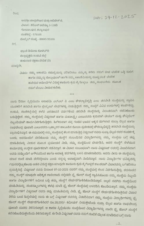 ಸಂತ್ರಸ್ತರು ನೀಡಿರುವ ದೂರಿನ ಪ್ರಕಾರ, ಸಂಸ್ಥೆಯಲ್ಲಿ ಕಾರ್ಯನಿರ್ವಹಿಸುತ್ತಿದ್ದ ಕೆಲ ಸಿಬ್ಬಂದಿಗಳು ನಂಬಿಕೆ ದ್ರೋಹ ನಡೆಸಿ ವಿದ್ಯಾರ್ಥಿಗಳಿಗೆ ತಪ್ಪು ಮಾಹಿತಿ ನೀಡಿ ಬೇರೆ ಸಂಸ್ಥೆಗಳಿಗೆ ಸೆಳೆಯುವ ಪ್ರಯತ್ನ ನಡೆಸಿದ್ದರು. ಈ ಕುರಿತು ಪೊಲೀಸ್ ದೂರು ನೀಡಿದ್ದಕ್ಕೆ ಪ್ರತಿಕಾರವಾಗಿ, ದಿನಾಂಕ 12-12-2025ರಂದು ಸಂತೆಕಟ್ಟೆಯ ಮಧುವನ ಹೋಟೆಲ್ನಲ್ಲಿ ಆರೋಪಿಗಳು ಸಂಘಟಿತವಾಗಿ ಸಭೆ ನಡೆಸಿ ₹2 ಕೋಟಿ ಹಣ ನೀಡಬೇಕು ಅಥವಾ ಅಕಾಡೆಮಿಯನ್ನು ಮುಚ್ಚಬೇಕು, ಇಲ್ಲವಾದರೆ ಜೀವದಿಂದ ಮುಗಿಸುವುದಾಗಿ ಬೆದರಿಕೆ ಹಾಕಿದ್ದಾರೆ ಎಂದು ಆರೋಪಿಸಲಾಗಿದ್ದು ಈ ಪ್ರಕರಣಕ್ಕೆ ಸಂಬಂಧಿಸಿ ಉಡುಪಿ ನಗರ ಪೊಲೀಸ್ ಠಾಣೆಯಲ್ಲಿ ಅಪರಾಧ ಕ್ರಮ ಸಂಖ್ಯೆ 211/2025ನ್ನು BNS ಕಲಂ 308(5), 352, 351(2) ಹಾಗೂ R/W 3(5) BNS ಅಡಿಯಲ್ಲಿ ದಾಖಲಿಸಲಾಗಿದ್ದು, ಆರೋಪಿಗಳು ಹಣಬಲ ಮತ್ತು ಪ್ರಭಾವ ಹೊಂದಿರುವ ಸಮಾಜವಿರೋಧಿ ಹಿನ್ನೆಲೆಯವರು ಎನ್ನಲಾಗಿದೆ. ಇದರಿಂದಾಗಿ ಸಂತ್ರಸ್ತರ ಕುಟುಂಬ ನಿರಂತರ ಜೀವಭಯದಲ್ಲಿ ಬದುಕುವ ಪರಿಸ್ಥಿತಿ ನಿರ್ಮಾಣವಾಗಿದೆ ಎಂದು ವೇದಿಕೆಗೆ ಸಂತ್ರಸ್ತರು ಮನವಿ ಸಲ್ಲಿಸಿ ವಿನಂತಿಸಿ ಕೊಂಡಿದ್ದಾರೆ ಎಂದು ವೇದಿಕೆ ತಿಳಿಸಿದೆ.
