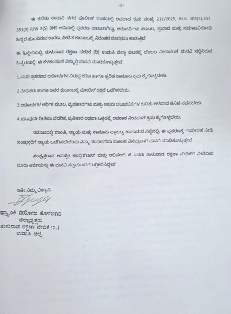 ಈ ಕುರಿತು ಉಡುಪಿ ಜಿಲ್ಲಾ ಪೊಲೀಸ್ ವರಿಷ್ಠಾಧಿಕಾರಿಗಳಿಗೆ ಮನವಿ ಸಲ್ಲಿಸಿದ ಬಳಿಕ ಮಾತನಾಡಿದ ತುಳುನಾಡ ರಕ್ಷಣಾ ವೇದಿಕೆಯ ಜಿಲ್ಲಾ ಅಧ್ಯಕ್ಷ ಫ್ರಾಂಕಿ ಡಿಸೋಜ ಕೊಳಲಗಿರಿ ಅವರು, ಈ ಪ್ರಕರಣ ಅತ್ಯಂತ ಗಂಭೀರ ಹಾಗೂ ಸಮಾಜದ ಶಾಂತಿ ಮತ್ತು ಕಾನೂನು ವ್ಯವಸ್ಥೆಗೆ ಸವಾಲು ಎಸೆಯುವಂತಹದ್ದು ಎಂದು ಹೇಳಿದರು.