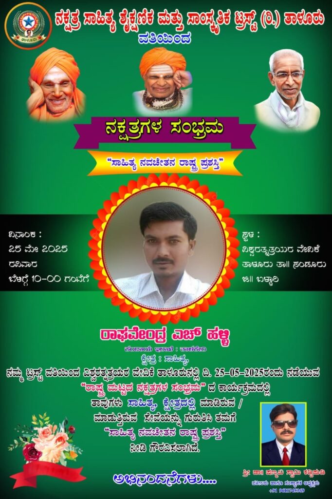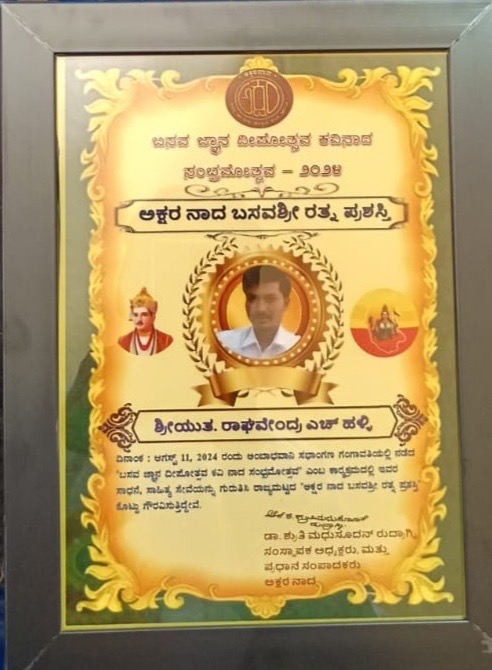 “11-8-2024 ರಂದು ಗಂಗಾವತಿಯಲ್ಲಿ ನಡೆದ ಬಸವಜ್ಞಾನ ದೀಪೋತ್ಸವ ಹಾಗೂ ಕವಿನಾದ ಸಂಭ್ರಮೋತ್ಸೋವ ಕಾರ್ಯಕ್ರಮದಲ್ಲಿ ಅಕ್ಷರನಾದ ” ಬಸವ ಶ್ರೀ ರತ್ನ ಪ್ರಶಸ್ತಿ ” ದೊರಕಿದ್ದು ಇನ್ನು ದಿನನಿತ್ಯ ಕರ್ನಾಟಕದ್ಯಾದಂತ ಸಾಹಿತ್ಯ ಬಳಗ ನಡೆಸುವ ಕವನ ಸ್ಪರ್ಧೆಯಲ್ಲಿ ಬಾಗವಸಿದಕ್ಕಾಗಿ ಸಾವಿರಾರು ಅಭಿನಂದನಾ ಪತ್ರ ಪ್ರಶಸ್ತಿ ಪತ್ರ ನೀಡಿ ಗೌರವಿಸಲಾಗುತ್ತದೆ