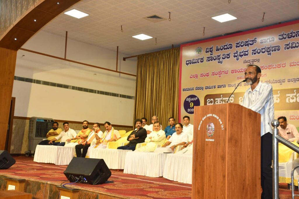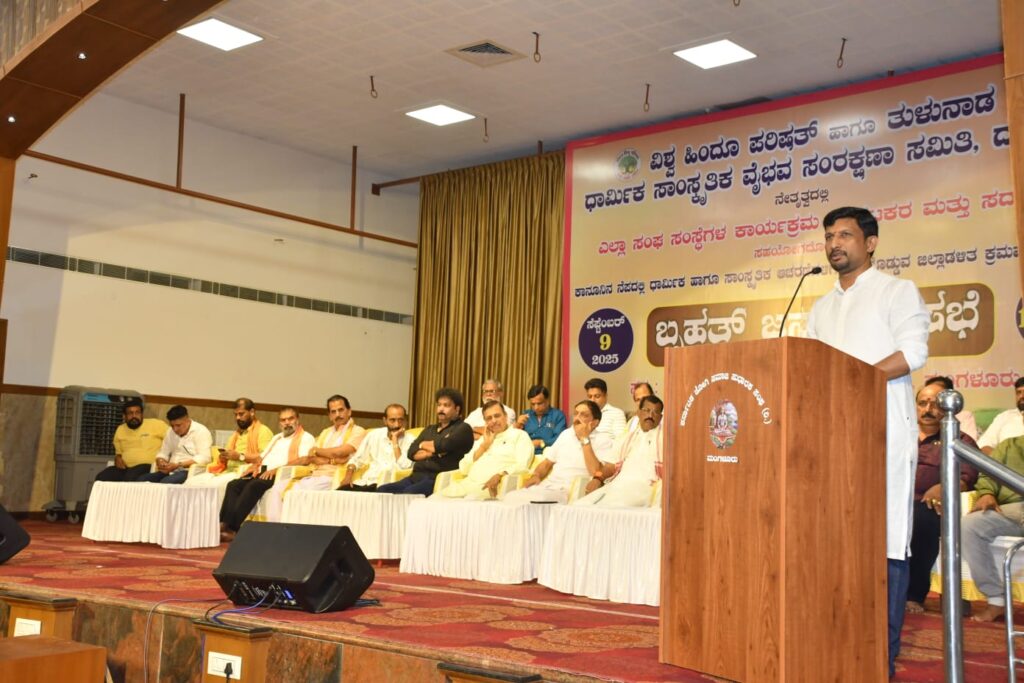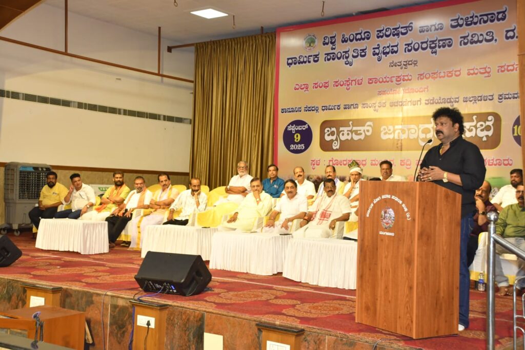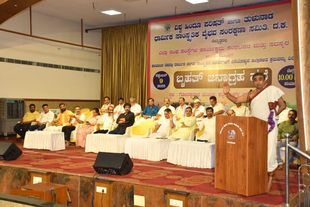 ಮಂಗಳೂರು, ಸೆ. 9: ದಕ್ಷಿಣ ಕನ್ನಡ ಜಿಲ್ಲೆಯ ಸಂಸ್ಕೃತಿಯ ಹಾಗೂ ಧಾರ್ಮಿಕ ಆಚರಣೆಗಳ ವಿರುದ್ಧ ಜಿಲ್ಲಾಡಳಿತ ಕೈಗೊಂಡಿರುವ ಕ್ರಮಗಳಿಗೆ ತೀವ್ರ ವಿರೋಧ ವ್ಯಕ್ತಪಡಿಸಿ ಮಂಗಳೂರಿನ ಕದ್ರಿಯ ಗೋರಕ್ಷನಾಥ ಮಂದಿರ ಪಾರ್ಕ್ನಲ್ಲಿ ಸೋಮವಾರ ಬೃಹತ್ ಜನಾಗ್ರಹ ಸಭೆ ಜರುಗಿತು. ವಿಶ್ವ ಹಿಂದೂ ಪರಿಷತ್ ಹಾಗೂ ತುಳುನಾಡ ಧಾರ್ಮಿಕ ಸಾಂಸ್ಕೃತಿಕ ವೈಭವ ಸಂರಕ್ಷಣಾ ಸಮಿತಿ ನೇತೃತ್ವದಲ್ಲಿ ನಡೆದ ಈ ಸಭೆಯಲ್ಲಿ ವಿವಿಧ ಕ್ಷೇತ್ರಗಳ ನೂರಾರು ಕಲಾವಿದರು ಹಾಗೂ ಸಾರ್ವಜನಿಕರು ಭಾಗವಹಿಸಿದರು.