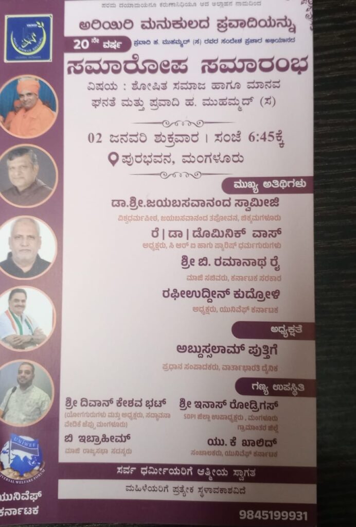 ಮಂಗಳೂರು | ಜನವರಿ 2 ಯುನಿವೆಫ್ ಕರ್ನಾಟಕದ ವತಿಯಿಂದ ಸೆಪ್ಟೆಂಬರ್ 19ರಿಂದ ಜನವರಿ 2ರವರೆಗೆ ನಡೆಯುತ್ತಿರುವ “ಅರಿಯಿರಿ ಮನುಕುಲದ ಪ್ರವಾದಿಯನ್ನು” ಎಂಬ ಪ್ರವಾದಿ ಸಂದೇಶ ಪ್ರಚಾರ ಅಭಿಯಾನದ ಸಮಾರೋಪ ಸಮಾರಂಭವು (ಜನವರಿ 2) ಶುಕ್ರವಾರ ಸಂಜೆ 6.45ಕ್ಕೆ ನಗರದ ಪುರಭವನದಲ್ಲಿ ಜರಗಲಿದೆ ಎಂದು ಅಭಿಯಾನ ಸಂಚಾಲಕರಾದ ಯು. ಕೆ. ಖಾಲಿದ್ ಪತ್ರಿಕಾಗೋಷ್ಠಿಯಲ್ಲಿ ತಿಳಿಸಿದ್ದಾರೆ.