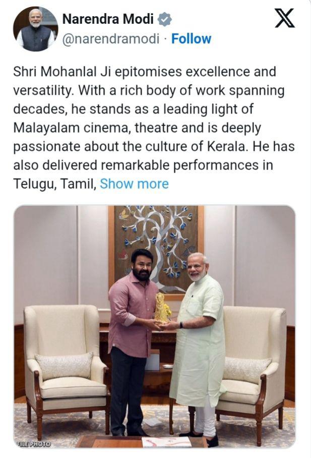 ನಟ ಮೋಹನ್ ಲಾಲ್ ಅವರನ್ನು ಅಭಿನಂದಿಸುತ್ತಾ ಪ್ರಧಾನಿ ನರೇಂದ್ರ ಮೋದಿ ಅವರು X ನಲ್ಲಿ ಪೋಸ್ಟ್ ಮಾಡಿದ್ದಾರೆ, “ಶ್ರೀ ಮೋಹನ್ ಲಾಲ್ ಜಿ ಶ್ರೇಷ್ಠತೆ ಮತ್ತು ಬಹುಮುಖತೆಯನ್ನು ಪ್ರತಿನಿಧಿಸುತ್ತಾರೆ. ದಶಕಗಳ ಕಾಲದ ಶ್ರೀಮಂತ ಕಾರ್ಯಗಳೊಂದಿಗೆ, ಅವರು ಮಲಯಾಳಂ ಸಿನಿಮಾ, ರಂಗಭೂಮಿಯ ಪ್ರಮುಖ ಜ್ಯೋತಿಯಾಗಿ ನಿಂತಿದ್ದಾರೆ ಮತ್ತು ಕೇರಳದ ಸಂಸ್ಕೃತಿಯ ಬಗ್ಗೆ ತೀವ್ರ ಒಲವು ಹೊಂದಿದ್ದಾರೆ. ಅವರು ತೆಲುಗು, ತಮಿಳು, ಕನ್ನಡ ಮತ್ತು ಹಿಂದಿ ಚಲನಚಿತ್ರಗಳಲ್ಲಿಯೂ ಗಮನಾರ್ಹ ಪ್ರದರ್ಶನ ನೀಡಿದ್ದಾರೆ. ಮಾಧ್ಯಮಗಳಲ್ಲಿ ಅವರ ಸಿನಿಮೀಯ ಮತ್ತು ರಂಗಭೂಮಿ ಪ್ರತಿಭೆ ನಿಜವಾಗಿಯೂ ಸ್ಪೂರ್ತಿದಾಯಕವಾಗಿದೆ.”