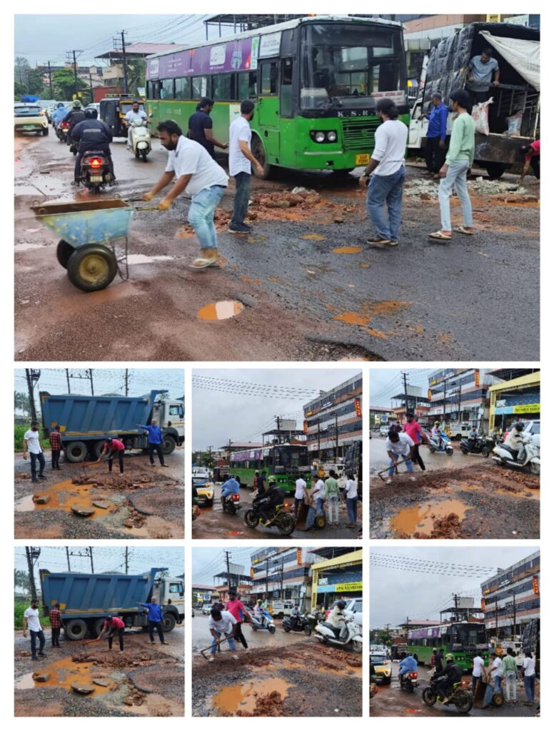 ನೇತೃತ್ವದಲ್ಲಿ ಬಜ್ಪೆ ಸ್ರಷ್ಟಿ ಹೋಟೆಲ್ ಮುಂಭಾಗ ಹದಗೆಟ್ಟ ಮುಖ್ಯ ರಸ್ತೆಯ ಗುಂಡಿ ಮುಚ್ಚುವ ಮೂಲಕ ಶ್ರಮದಾನ ಕಾರ್ಯಕ್ರಮ
