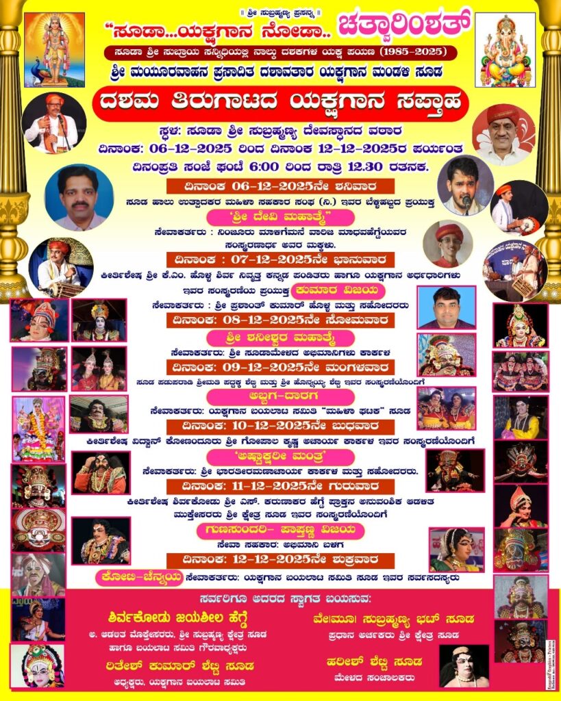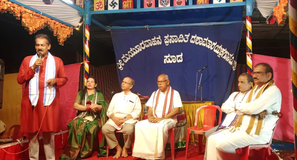 ಸೂಡ ಮಯೂರವಾಹನ ಪ್ರಸಾದಿತ ದಶಾವತಾರ ಯಕ್ಷಗಾನ ಮಂಡಳಿಯ ದಶಮ ಸಂಭ್ರಮ, ಸಪ್ತಾಹ ಮತ್ತು 10ನೇ ವರ್ಷದ ತಿರುಗಾಟ ಶುಭಾರಂಭ ಸಂದರ್ಭ ಸೂಡ ಹಾಲು ಉತ್ಪಾದಕರ ಮಹಿಳಾ ಸಹಕಾರ ಸಂಘದ ಬೆಳ್ಳಿಹಬ್ಬದ ಪ್ರಯುಕ್ತ ಶ್ರೀ ಸುಬ್ರಹ್ಮಣ್ಯ ದೇವಸ್ಥಾನದ ವಠಾರದಲ್ಲಿ ನಡೆದ ಕಾರ್ಯಕ್ರಮವನ್ನು ಉದ್ಘಾಟಿಸಿ ಅವರು ಮಾತನಾಡಿದರು. ಅಧ್ಯಕ್ಷತೆ ವಹಿಸಿದ್ದ ಸೂಡ ಶ್ರೀಸುಬ್ರಹ್ಮಣ್ಯ ದೇವಸ್ಥಾನದ ಆನುವಂಶಿಕ ಆಡಳಿತ ಮೊಕ್ತಸರ ಶಿರ್ವ ಕೋಡು ಜಯಶೀಲ ಹೆಗ್ಡೆ ಮೇಳದ ಸಂಚಾಲಕ ಮತ್ತು ಭಾಗವತ ಸೂಡ ಹರೀಶ್ ಶೆಟ್ಟಿ ಅವರಿಗೆ ಜಾಗಟೆ, ಗಂಟೆ ನೀಡಿ ಯಕ್ಷಗಾನ ತಿರುಗಾಟಕ್ಕೆ ಚಾಲನೆ ನೀಡಿದರು.