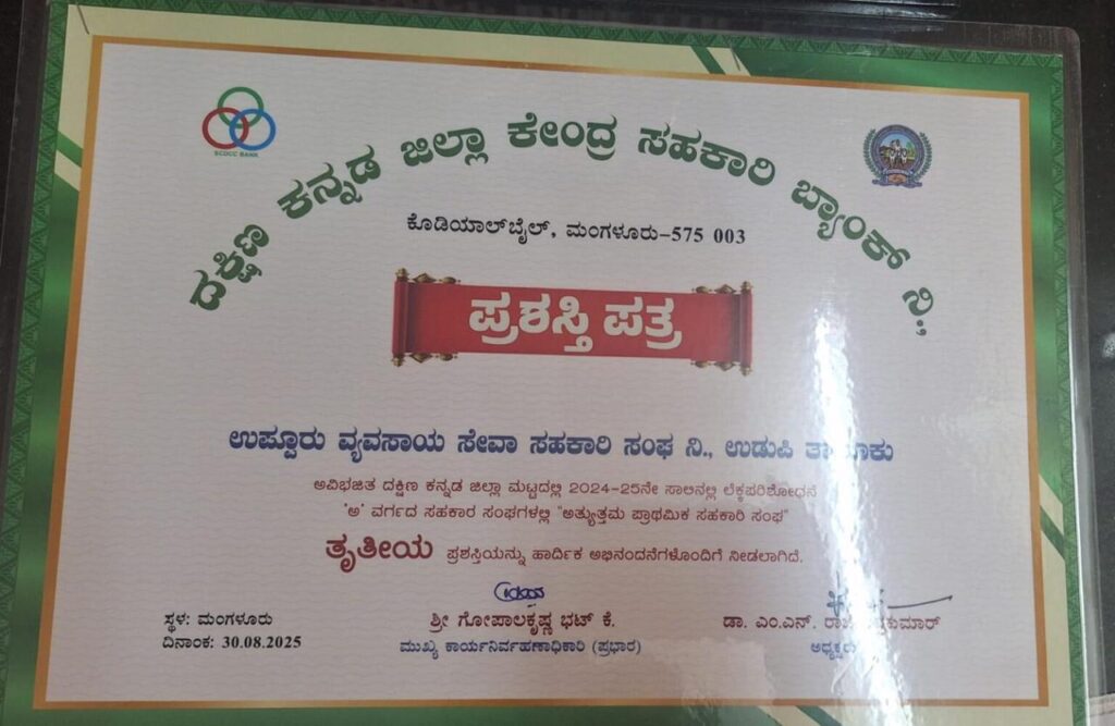 ದ.ಕ.ಜಿಲ್ಲಾ ಕೇಂದ್ರ ಸಹಕಾರಿ ಬ್ಯಾಂಕ್, ಮಂಗಳೂರು, ತನ್ನ 2024-2025 ಸಾಲಿನಲ್ಲಿ ಅತ್ಯುತ್ತಮ ಸಾಧನೆಗೈದು ಕಾರ್ಯನಿರ್ವಹಿಸುತ್ತಿರುವ ‘ಅ’ ವರ್ಗದ ಸಹಕಾರಿ ಸಂಘಗಳಿಗೆ ಪ್ರಶಸ್ತಿಗಳನ್ನು ಪ್ರದಾನ ಮಾಡುತ್ತಿದೆ. ಈ ಸಾಲಿನಲ್ಲಿ ಉಪ್ಪೂರು ವ್ಯವಸಾಯ ಸೇವಾ ಸಹಕಾರಿ ಸಂಘವು ಜಿಲ್ಲಾ ಬ್ಯಾಂಕಿನ ತೃತೀಯ ಪ್ರಶಸ್ತಿಗೆ ಆಯ್ಕೆಯಾಗಿದ್ದು, ಇದು ಸಂಘದ ಗಮನಾರ್ಹ ಸಾಧನೆಗೆ ಸಾಕ್ಷಿಯಾಗಿದೆ.