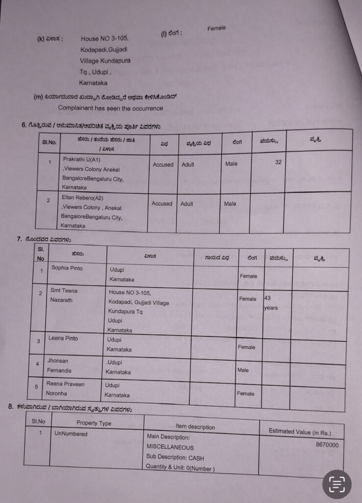 ಬೇರೆ ದೇಶಗಳಲ್ಲಿ ಉದ್ಯೋಗ ಪಡೆಯಲು ಬಯಸಿದ ಅನೇಕ ಜನರನ್ನು ವಂಚಿಸಿರುವ ಆರೋಪ ಎದುರಿಸುತ್ತಿರುವ ಬಂಗಲೂರಿನ ವಿವರ್ಸ್ ಕಾಲೋನಿ, ಅಂಕಲ್ ನಿವಾಸಿ ಶ್ರೀ ಎಲ್ಟನ್ ರೆಬೆಲೊ ಅವರ ಪತ್ನಿ ಪ್ರಕೃತಿ ವಿರುದ್ಧ ಉಡುಪಿ ಜಿಲ್ಲೆಯ ಪೊಲೀಸ್ ಇಲಾಖೆ ತನಿಖೆ ಪ್ರಾರಂಭಿಸಿದೆ.